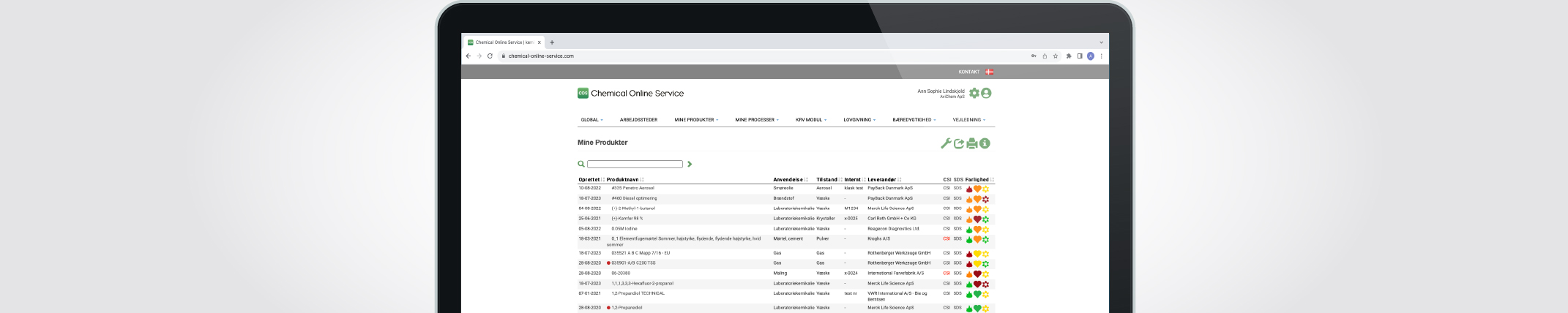 COS Introkursus (for kemiredaktører og operatører). Eksempel på produktoversigt i Chemical Online Service (COS) på en laptop.