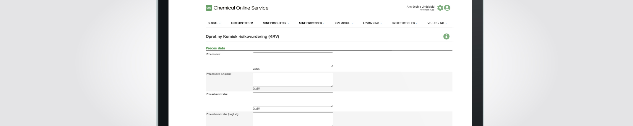 Eksempel på KRV-modul i COS hvor der oprettes en ny kemisk risikovurdering (KRV) i computer.