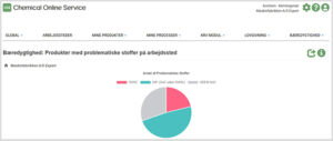 Skærmbillede af eksempel på bæredygtidhedsmodulet i COS. Billede af lagkagediagram der viser produkter med problematiske stoffer på arbejdssted