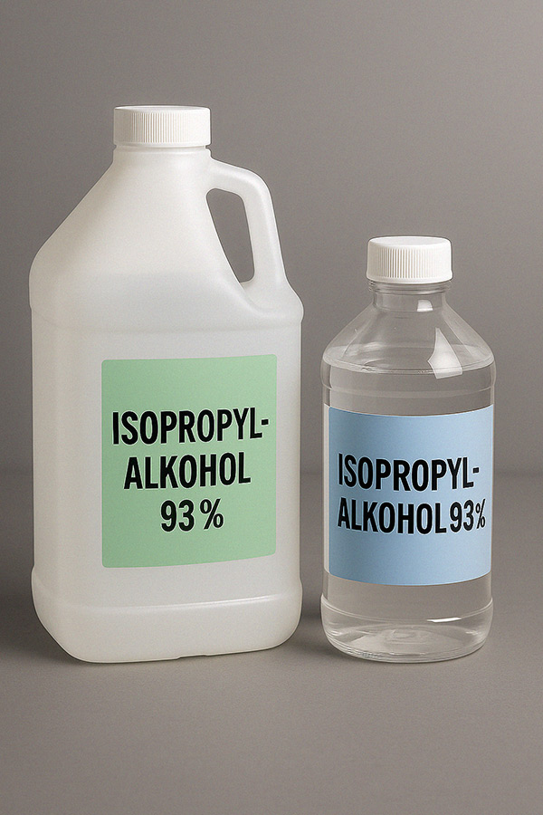 To flasker med isopropylalkohol 93%.